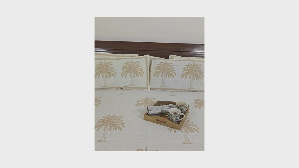 Enhance your bedroom decor with our Moriyo Decor Rajasthani Hand Block Printed Bedsheets, featuring a Cheerful Sandy Yellow Palm Design. Available in King 90×108 Inches (229×274 cm)  Sizes, these Premium Cotton Sheets come with Matching Pillowcases, offering a perfect blend of Luxury and Traditional Craftsmanship.