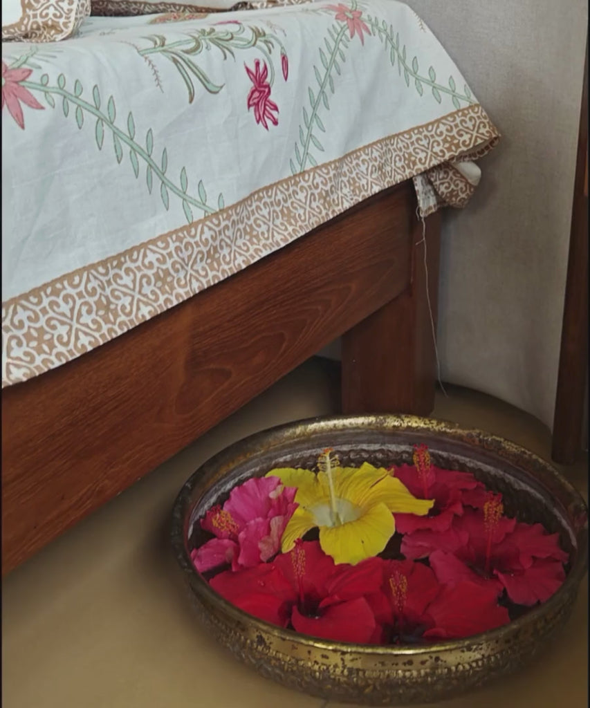 • Artisanal Craftsmanship: Hand block printed Rajnigandha design by Moriyo Decor adds a unique, artistic touch.